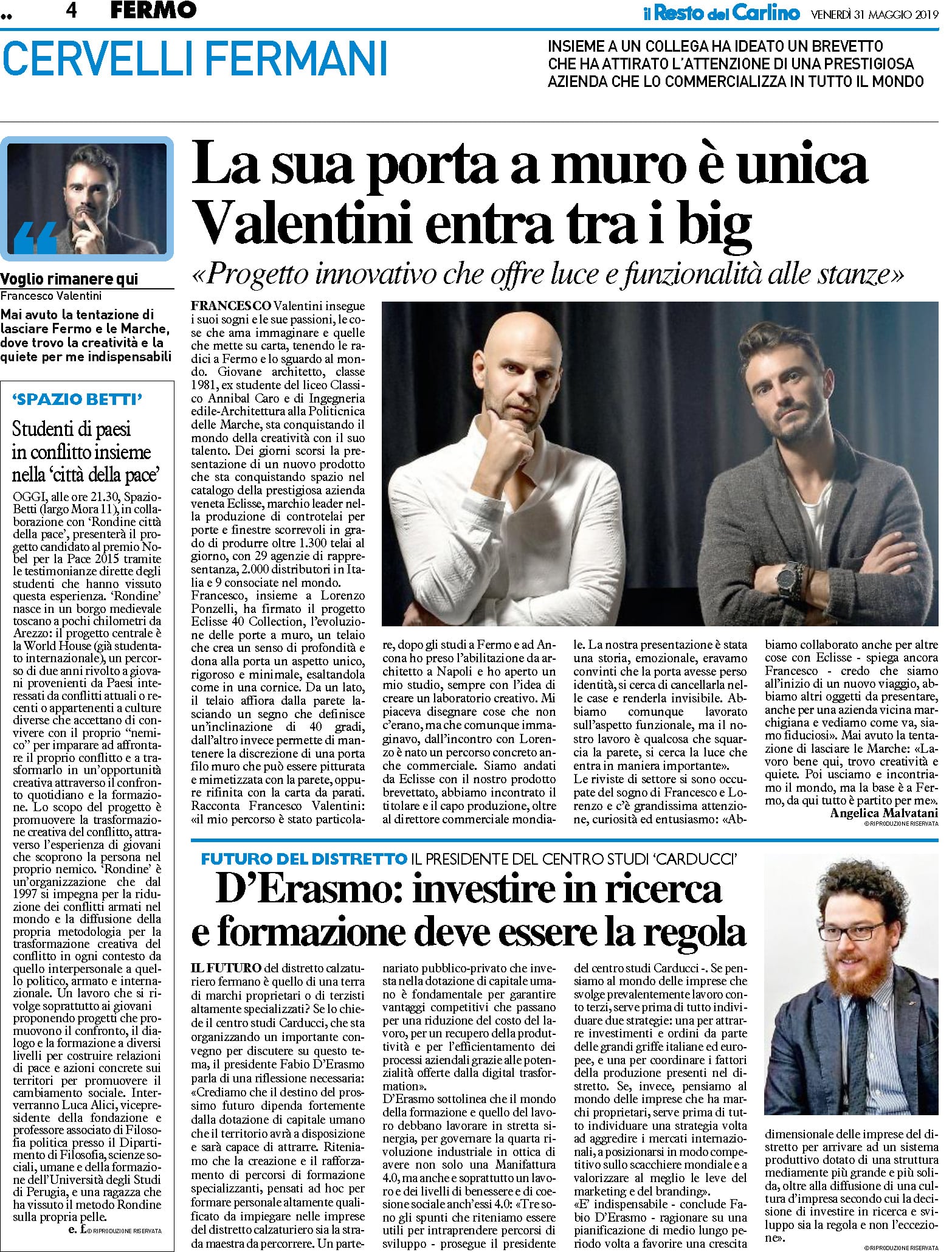 Francesco Valentini insegue i suoi sogni e le sue passioni, le cose che ama immaginare e quelle che mette su carta. Tenendo le radici a Fermo e lo sguardo al mondo. Giovane architetto, classe 1981, ex studente del liceo Classico Annibal Caro e di Ingegneria edile-Architettura alla Politecnica delle Marche, sta conquistando il mondo della creatività con il suo talento. Dei giorni scorsi la presentazione di un nuovo prodotto che sta conquistando spazio nel catalogo della prestigiosa azienda veneta Eclisse, marchio leader nella produzione di controtelai per porte e finestre scorrevoli. Francesco, insieme a Lorenzo Ponzelli, ha firmato il progetto eclisse 40 Collection, l’evoluzione delle porte filo muro. Un telaio che crea un senso di profondità e dona alla porta un aspetto unico, rigoroso e minimale, esaltandola come in una cornice.
