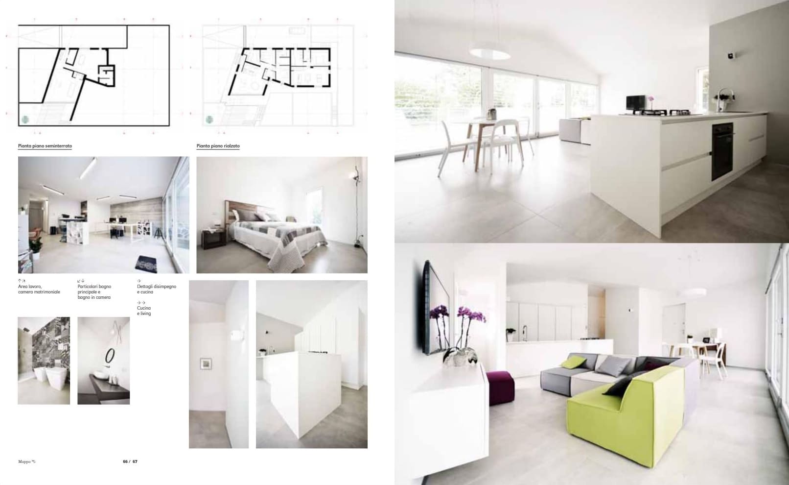 L’impianto della casa si sviluppa partendo da un accesso alla quota stradale. Scendendo, si passa attraverso un patio – giardino che conduce direttamente all’officina, allo spazio di lavoro. Qui l’ambiente è caratterizzato da pareti in cemento armato faccia vista che perfettamente si allineano con lo stile dell’arredo e dell’illuminazione. Lo spazio residenziale è situato al piano rialzato al quale si accede tramite una scala. Ci si trova davanti ad uno spazio molto suggestivo, caratterizzato in copertura da scorci e fughe, a cui si contrappongono i tramezzi, che risultano “apparentemente” dis-allineati, traslati e ruotati, rispetto alla geometria pura del manufatto.